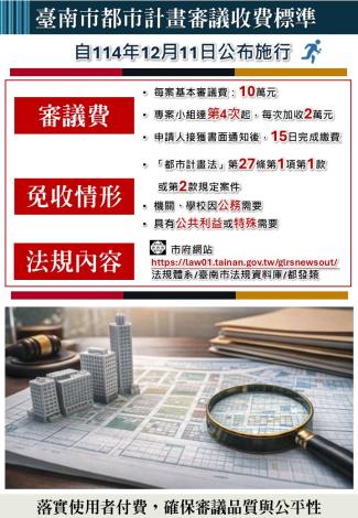 為辦理本市都市計畫相關審議作業,需聘請專家學者協助審議、印製相關資料與增加機關人力等費用支出,為落實規費法有效利用公共資源,本於使用者付費原則及合理支應審議作業所需行政成本,市府訂定「臺南市都市計 ...更多