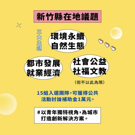 (一)申請對象:年滿18歲至45歲之青年,對公共議題具關注,並組成2至5人之提案團隊。