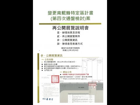 3.計畫書公開展覽地點為本府公告欄、本府都市發展局都市計畫管理科公告欄(永華市政中心)、本府都市發展局都市規劃科公告欄(民治市政中心)、本市南區區公所公告欄。亦可至本府網站(https://www.tainan.gov.tw/)市政公告與本府都市發展局網站(http://ud.tainan.gov.tw/UPBUD_sys/)公告事項下查詢。