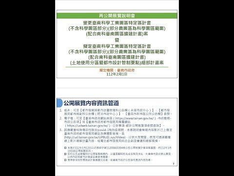 1.說明會時間及地點:民國112年5月30日(星期二)下午2時0分,假南區區公所3樓大會議室舉行公開展覽說明會(地址:台南市明興路2號)。